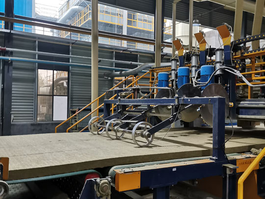 齊工巖棉板是以玄武巖為主要原材料,經(jīng)過沖天爐高于1450℃使原材料充分熔化,經(jīng)過高速離心機(jī)甩絲,形成巖棉纖維,用高速鼓風(fēng)機(jī)使其噴吹冷卻成型,在噴吹過程中添加一定比例的高效粘合劑,由大型擺錘設(shè)備呈三維布棉狀態(tài)均勻鋪棉,由履帶將布好的巖棉傳送至壓力設(shè)備中,使其形成一定密度的巖棉板,后經(jīng)高溫烘干爐烘干后,送至冷卻出風(fēng)口使其冷卻固化,切割不同規(guī)格的成品。